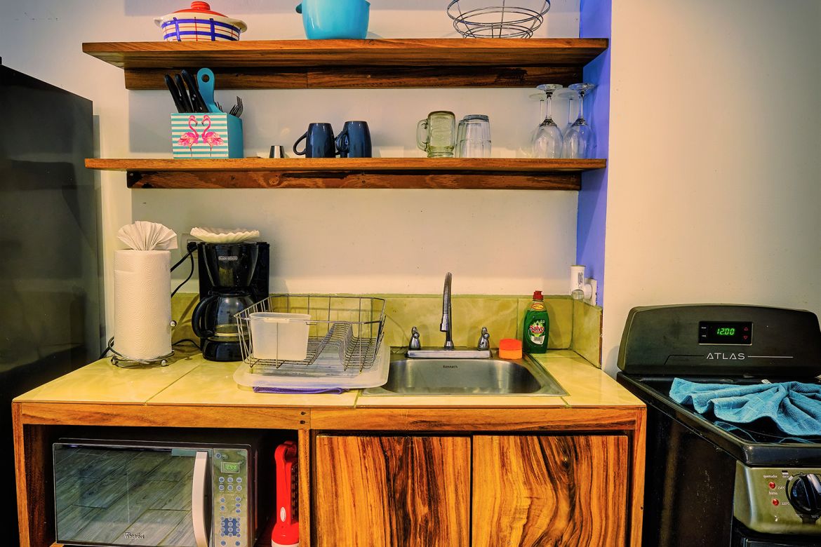 or two children. It comes equipped with a queen bed and a bunkbed. It has a full kitchen, full bath, dining/living area, TV with cable and private balcony overlooking the beach. There is a/c, hot water, high speed internet and shared washer and dryer. Really everything that a small family could need. Linins and towels are provided as is cleaning service if you stay for longer than one week.